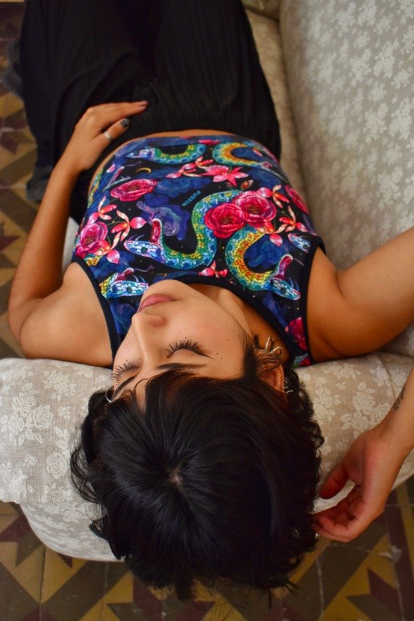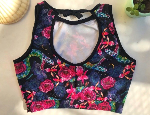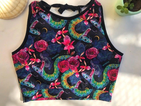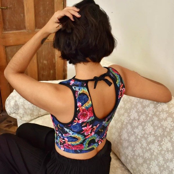 Top de lycra deportiva corte halter. Diseño de gota en la espalda.